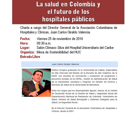 El próximo viernes 25 de noviembre a las 09:30 a.m. en el Salón Clímaco Silva del Hospital Universitario del Caribe (HUC), en Zaragocilla, se llevará a cabo la Charla: “La salud en Colombia y el futuro de los hospitales públicos”, con el director general de la Asociación Colombiana de Hospitales y Clínicas, Dr. Juan Carlos Giraldo Valencia.