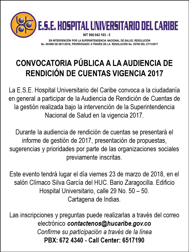 A continuación, encontrará diferentes documentos que le permitirán hacer parte activa del proceso de Rendición de Cuentas vigencia 2017, de la E.S.E. Hospital Universitario del Caribe, quien reitera el compromiso de realizar esta labor, que promueve los principios de Transparencia y Participación Ciudadana.