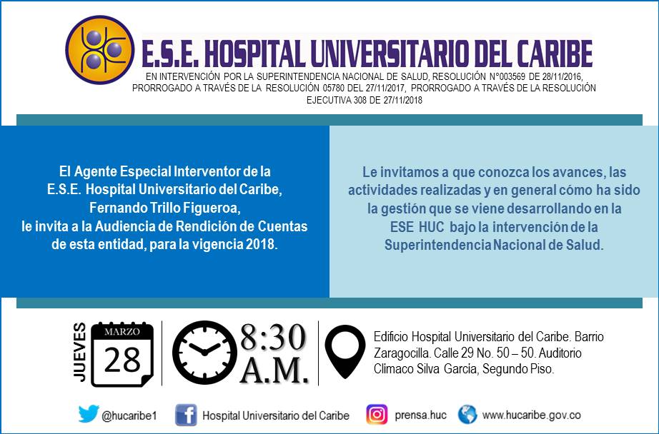 A continuación, encontrará diferentes documentos que le permitirán hacer parte activa del proceso de Rendición de Cuentas vigencia 2018, de la E.S.E. Hospital Universitario del Caribe, quien reitera el compromiso de realizar esta labor, que promueve los principios de Transparencia y Participación Ciudadana.